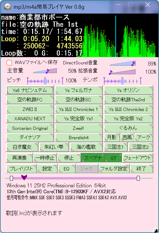 日本ファルコムのbgm再生、mp3/m4a/flac/dsdの再生、DirectShowの再生、kpiプラグインの再生を行う
