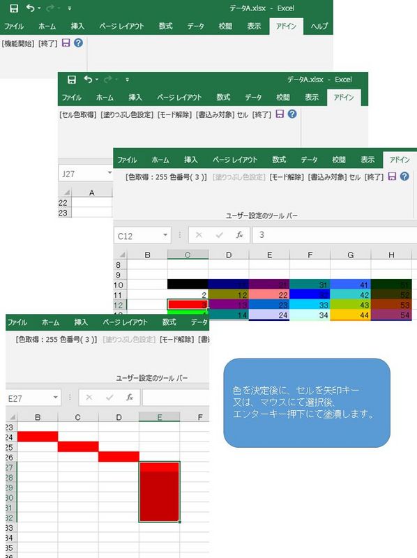 Enterキーにて連続してセル色塗潰し、または、フォント色塗潰しする