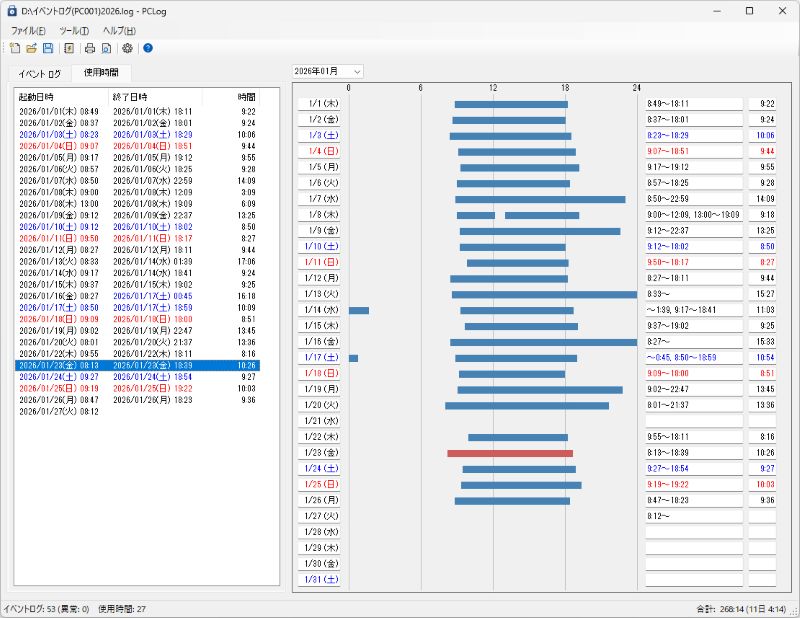 お使いのパソコンのログから起動時間と終了時間を取得し使用時間をグラフで確認